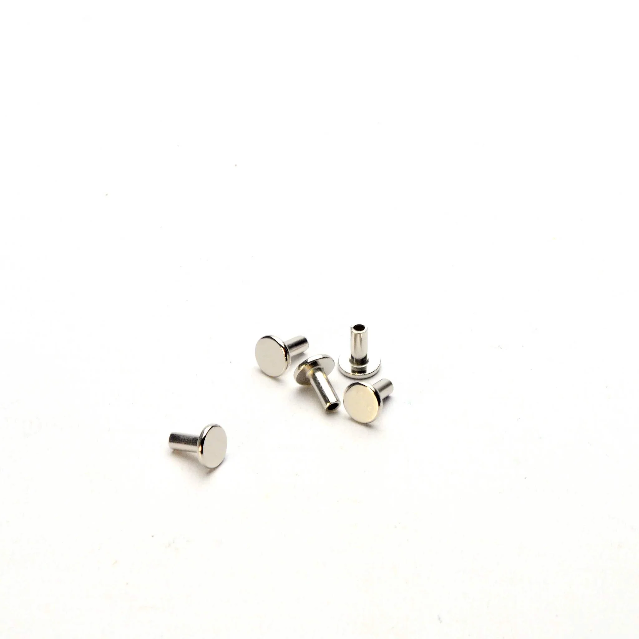 Flat headed tubular rivets in nickel or copper plated steel, sometimes called 'one piece rivets' or split rivets.